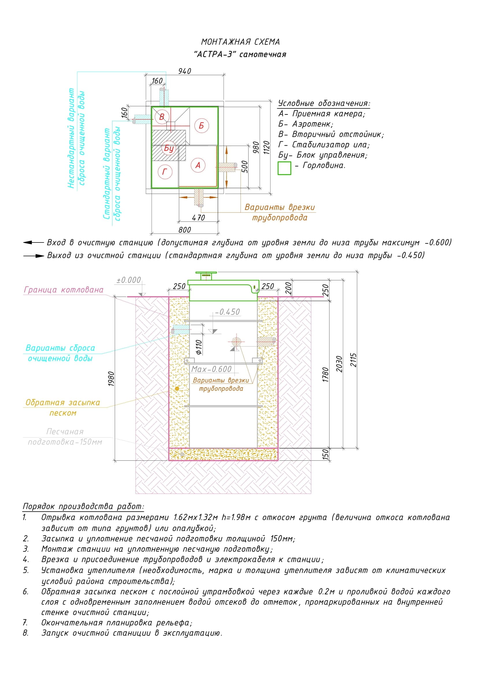 Стандарт — высота станции 2,36 м. Врезка (вход трубы) до 0,85 м от уровня земли до нижнего края трубы.